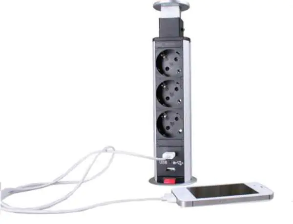 Przedłużacz teleskopowy 3-gniazdkowy z ładowarką USB Bardzo przydatny zarówno w biurze jak i domu przedłużacz- listwa zasilająca. Posiada 3 gniazda do podłączenia urządzeń elektrycznych oraz jedno do USB. Dzięki zastosowaniu ogranicznika na jego szczycie, można łatwo go zamaskować w biurku. Opis: Stan: nowy Teleskopowy przedłużacz z 3 gniazdkami, w komplecie port USB, przeznaczony do biurek lub blatów kuchennych Port USB nadaje się do każdego złącza USB Subtelny design Szybka i łatwa instalacja Głębokość montażu przynajmniej 260 mm Max. moc: 3.500W Długość kabla przyłączeniowego: 1055 mm Ochrona przed przepięciem, przegrzaniem, zabezpieczenie przed dziećmi Klasa ochrony: 1 Kabel USB i telefon służą wyłącznie do dekoracji (nie są objęte dostawą)