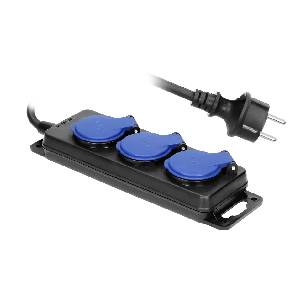 Przedłużacz warsztatowy, bryzgoszczelny z kablem w izolacji gumowej. Posiada 3 gniazda sieciowe z uziemieniem i przesłonami torów prądowych oraz pokrywami uszczelniającymi, które chronią przed zabrudzeniami i wilgocią. Zawieszka ułatwia montaż w bezpiecznym miejscu, a otwory służą do stałego montażu na stanowisku pracy. Długość kabla 5m.