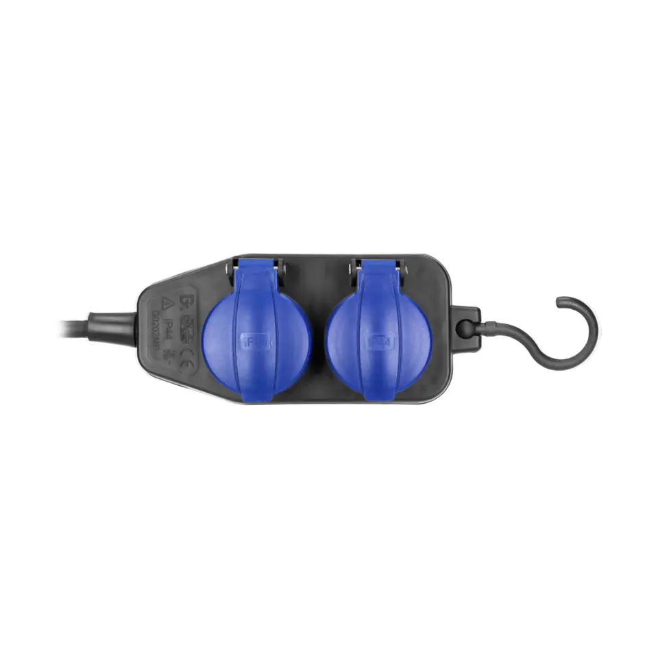 Przedłużacz warsztatowy, bryzgoszczelny bez wyłącznika z kablem w izolacji gumowej. Posiada 4 gniazda (2+2) sieciowe typu schuko z uziemieniem i przesłonami torów prądowych oraz pokrywami uszczelniającymi, które chronią przed zabrudzeniami i wilgocią. Dodatkowy hak, ułatwia montaż na stanowisku pracy.