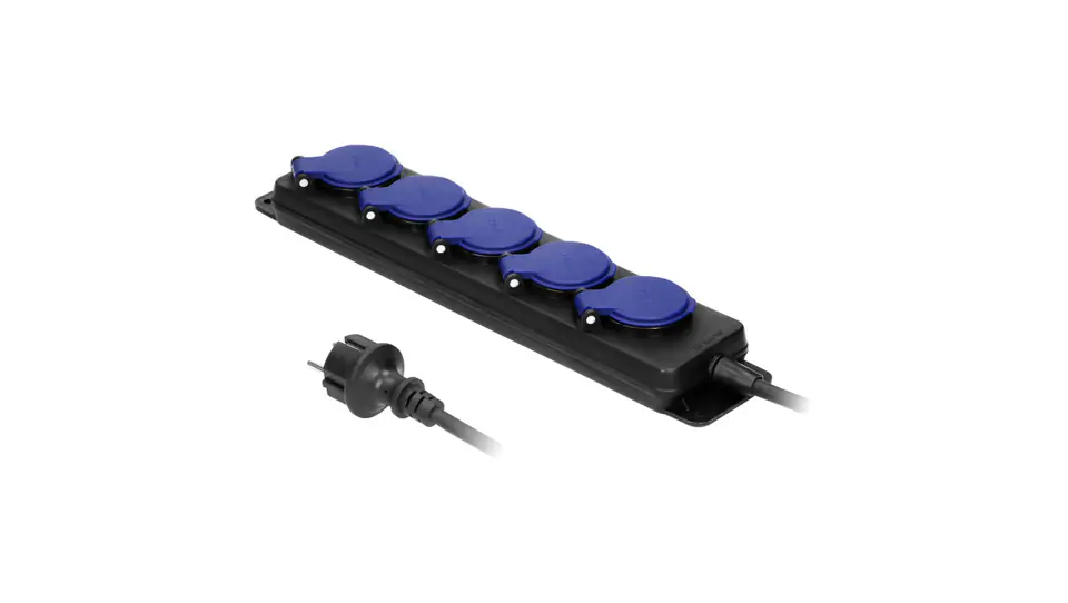 Przedłużacz warsztatowy, bryzgoszczelny z kablem w izolacji gumowej. Posiada 5 gniazd sieciowych z uziemieniem i przesłonami torów prądowych oraz pokrywami uszczelniającymi, które chronią przed zabrudzeniami i wilgocią. Zawieszka ułatwia montaż w bezpiecznym miejscu, a otwory służą do stałego montażu na stanowisku pracy. Długość kabla 5m.
