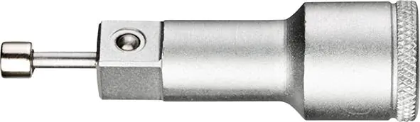 Wykonanie: DIN 3120 – ISO 1174, z ustalaczem kulkowym. Ze stali wanadowej 31CrV3 GEDORE, odkuwana i chromowana, sprężysty trzpień manganofosforyzowany. Podtrzymujący magnes ustala śruby w końcówce wymiennej klucza nasadowego i uniemożliwia ich zagubienie. Dzięki sprężynowemu układowi mechanicznemu magnes przytrzymujący ma zawsze bezpośredni kontakt z łbem śruby i zapewnia jej centryczne prowadzenie.