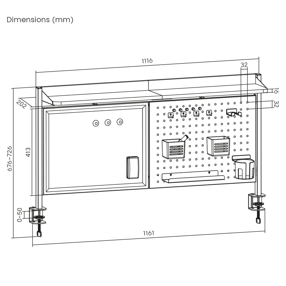 Centralnym punktem nadstawki ER-301 jest tablica magnetyczna suchościeralna, na której można wygodnie zapisywać notatki markerem (dołączonym do zestawu) i ścierać je przy pomocy gąbki. Obok niej znajduje się metalowa tablica perforowana umożliwiająca swobodne rozmieszczenie akcesoriów. W zestawie znajdują się m.in. cztery haczyki, dwa pojemniki na długopisy, pojemnik na kubek, półeczka, a także komplet 5 pinezek magnetycznych i 3 magnesy, co daje pełną swobodę organizacyjną. Wszystko to sprawia, że nadstawka ER-301 staje się nie tylko estetycznym uzupełnieniem biurka, ale również niezwykle praktycznym narzędziem organizacyjnym, które zwiększa efektywność pracy i poprawia komfort codziennego użytkowania.