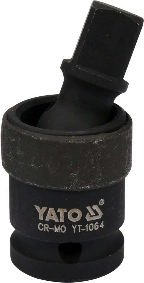 Komplementarny produkt, umożliwający pracę nasadek oraz przedłużek udarowych w trudno dostępnych miejscach i przy głęboko osadzonych śrubach. Przegub pozwala na pracę pod kątem od 0 do 25 stopni, został wykonany z jednakowych materiwłów co nasadki. Trzpień oraz kula przegubu zostały zabezpieczone ciasno pasowaną tuleją zamykająca gniazdo. Dodatkowo przegub posiada zatrzask kulisty mocujący nasadkę. Stal CrMo SCM-440 to unikalna stal stopowa, która posiada 2 krotnie wiekszą wytrzymałość na rozciąganie od zwykłej stali węglowej oraz 3 krotnie wyższą granicę plastyczności. Te cechy powodują, że nasadki YATO przez wydłużony czas zachowują swój nominalny wymiar oraz nie pękają pod wpływem pracy udarowej.