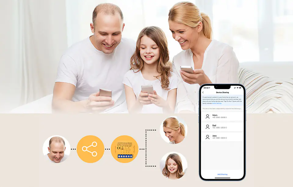 Dzięki funkcji "Family Share" możesz udostępnić sterowanie przełącznikiem wielu użytkownikom w swojej rodzinie. To świetne rozwiązanie, które pozwoli dostosować oświetlenie do aktualnych potrzeb wszystkich mieszkańców.