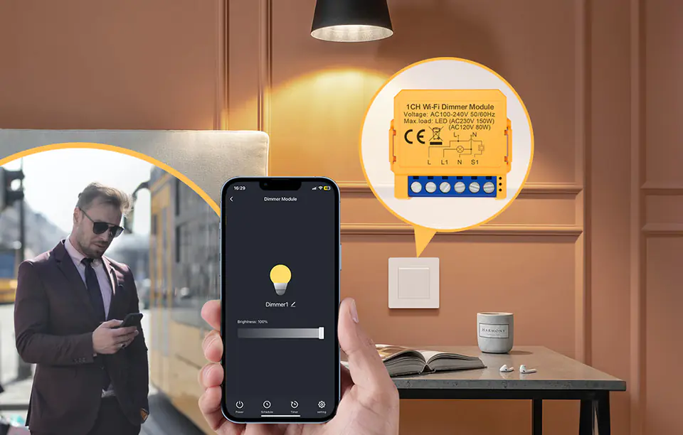 Kontroluj oświetlenie w swoim domu bez wstawania z wygodnego fotela. Aplikacja mobilna umożliwia intuicyjne zarządzanie przełącznikiem. Możesz włączać i wyłączać światło, regulować jego jasność oraz ustalać harmonogramy działania — wszystko z poziomu swojego smartfona.