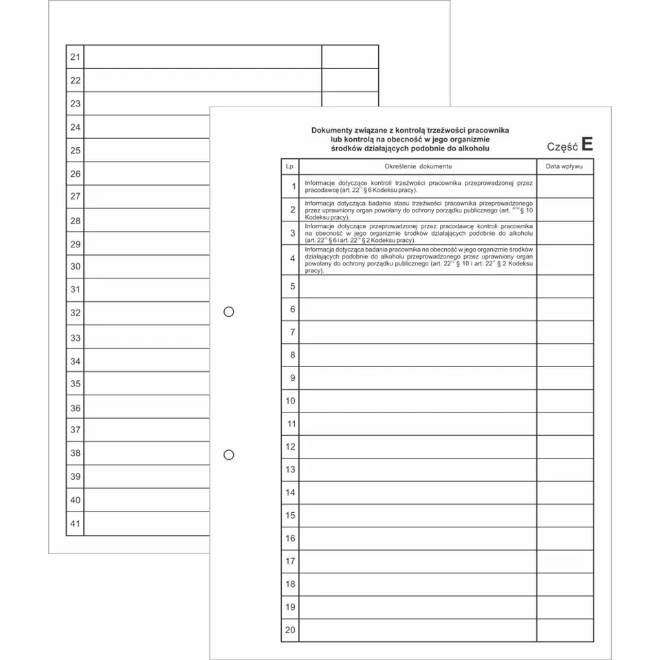 - Przekładka E - dokumenty związane z kontrolą na obecność w organizmie zatrudnionego alkoholu lub narkotyków.