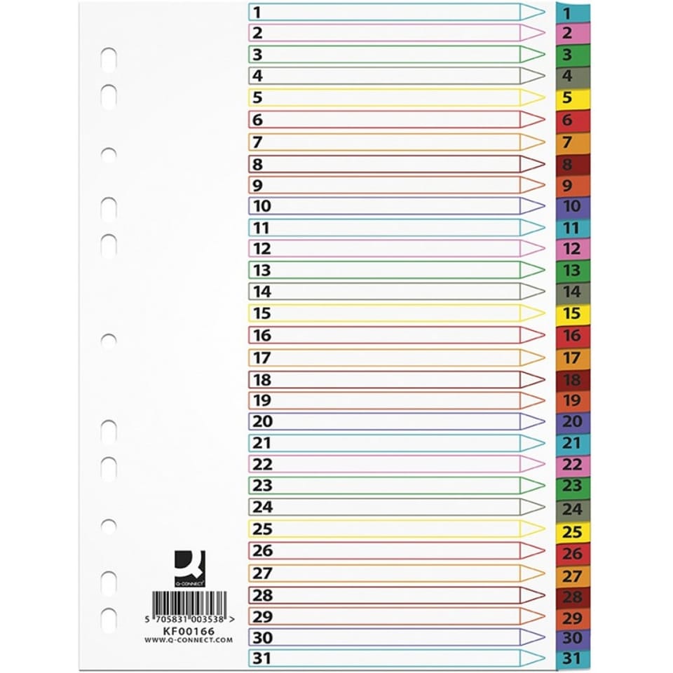 * kartonowe przekładki w formacie A4, o gramaturze 170gsm * ilość kartonowych przekładek z plastikowym, kolorowym indeksem: 31 * posiada 11 dziurek do wpięcia ze wzmocnionym obszarem europerforacji * każdy komplet osobno pakowany w folię * wymiary przekładki: 225x297mm