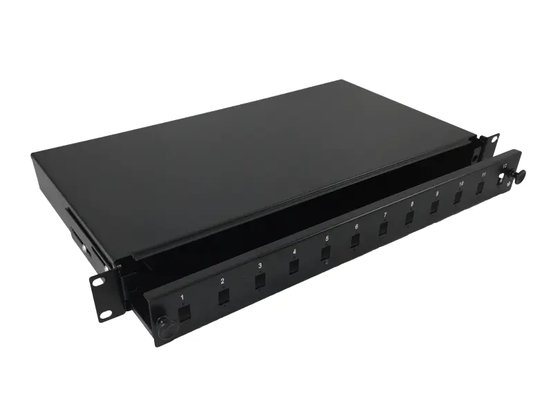Panel światłowodowy z wysuwalną tacką do montażu w szafach i stojakach 19", 12 portów SC simplex, kolor czarny.