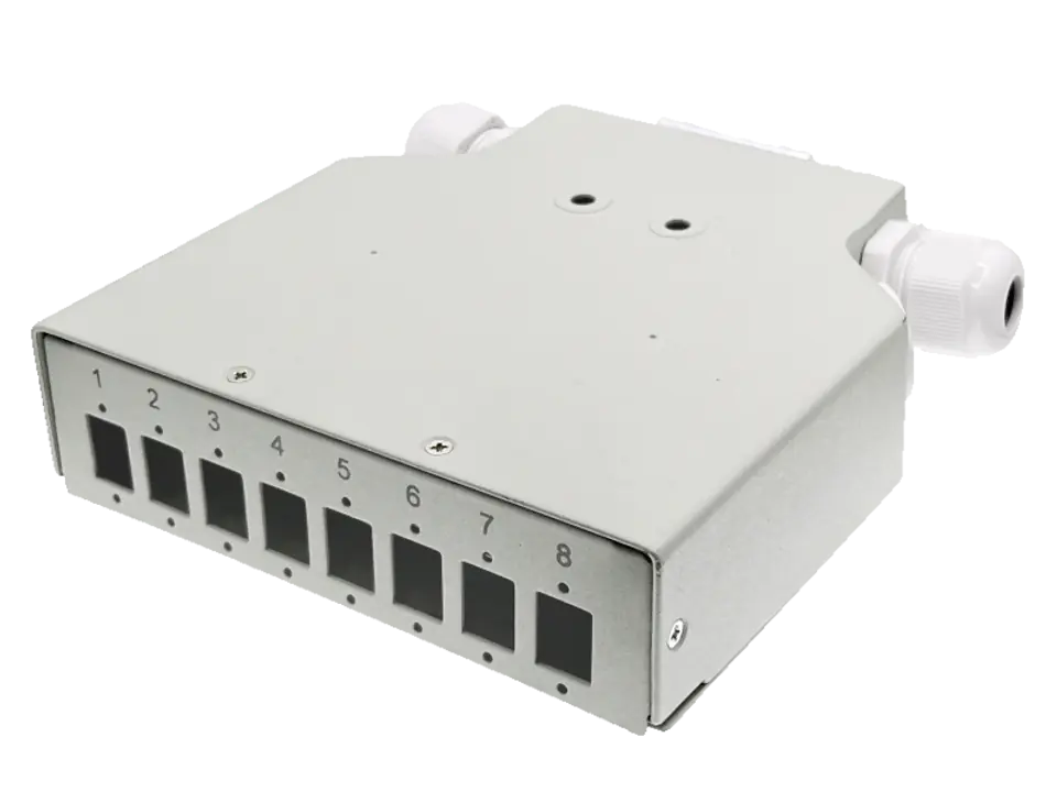 Przełącznica światłowodowa do montażu na szynie DIN (TH35, TS35, DIN-3) z otworami pod 8 adapterów SC simplex, 8 adapterów LC duplex lub 8 adapterów E2000.