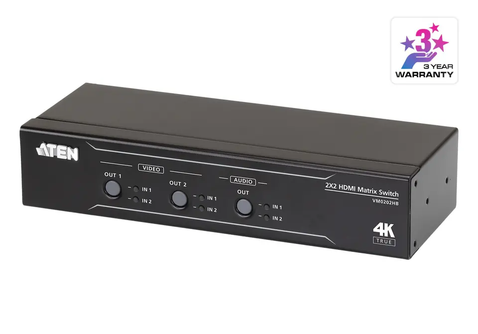 - VM0202HB to kompaktowy przełącznik matrycowy 2 x 2 kompatybilny ze źródłem HDMI i urządzeniami wyświetlającymi. Każde wejście można skierować na dowolne wyjście, zmniejszając potrzebę przenoszenia urządzeń lub kabli podczas wyświetlania treści z różnych źródeł HDMI na różnych wyjściach. Jest idealny do sal konferencyjnych i klas, a także do każdego miejsca, w którym musisz przełączać się między 2 różnymi źródłami wideo na różnych wyświetlaczach.
