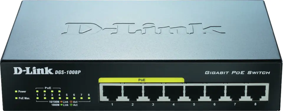 DGS-1008P jest przełącznikiem warstwy drugiej. Urządzenie posiada tablicę adresów MAC o pojemności 4000 pozycji oraz bufor o pojemności 192 KB. Dzięki obsłudze funkcji Auto MDI-MDIX dla standardu Ethernet do przełącznika podłączyć można zarówno kabel prosty jak i z przeplotem. Cztery z gniazd zasilane są za pomocą PoE. Obsługa funkcji PoE (Power over Ethernet) pozwala na przesył energii elektrycznej za pomocą skrętki RJ-45 do urządzenia. Dzięki temu można zasilać urządzenia takie jak bezprzewodowe punkty dostępowe, kamery sieciowe IP lub telefony, bezpośrednio z kabli sieciowych. DGS-1008P jest wyposażony w gigabitowe porty dla szybkiego transferu danych i technologię D-Link Green w celu efektywnego oszczędzania energii, gdy przełącznik nie jest w użyciu. Jego konstrukcja bez wentylatora sprawia, że jest całkowicie cichy, więc jest idealnym rozwiązaniem dla biur, bibliotek i sal konferencyjnych.