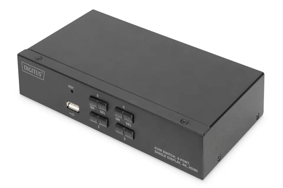 Dzięki 4-portowemu przełącznikowi KVM DIGITUS do obsługi pojedynczych monitorów można obsługiwać dwa komputery PC z obsługą 4K z jednej klawiatury USB i myszy. Za pomocą jednego przycisku lub klawisza skrótu można łatwo przełączać się między czterema komputerami i oszczędzić sobie kłopotu z podłączeniem wszystkich kabli. Wyjście do monitora odbywa się poprzez wyjście HDMI na tylnym panelu. Sygnały audio z mikrofonu i głośnika również mogą być przełączane. Ponadto na przednim panelu znajduje się port USB, który może być używany w przypadku innych urządzeń peryferyjnych, takich jak pamięci USB lub zewnętrzne dyski twarde w wszystkich komputerach. Podłączone urządzenia peryferyjne są przypisane do aktywnego komputera PC. Diody LED z informacją o stanie na przednim panelu przełącznika pokazują przez cały czas aktualną konfigurację. Wyłącznik uzupełnia solidna metalowa obudowa.