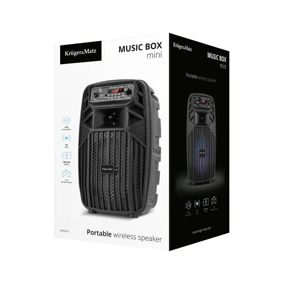 Przenośny głośnik Bluetooth Kruger&Matz Music Box Mini Głośnik przenośny do karaoke Szukasz sposobu, który pomoże Ci rozkręcić każdą domówkę? Idealnym wyborem będzie głośnik bezprzewodowy Kruger&Matz Music Box Mini, który łączy ze sobą funkcjonalność oraz niską cenę. Jedną z podstawowych cech, która powinna zwrócić Twoją uwagę to wejście mikrofonowe , które pozwoli zorganizować wieczór karaoke. Ty i Twoi znajomi wolicie potańczyć? Dwa przetworniki , w jakie został wyposażony ten głośnik – 6,5- oraz 1-calowy – zagrają z mocą 10 W . Jeśli jest to jednak dla Was za mało, możecie skorzystać z funkcji True Wireless Stereo , która pozwoli połączyć ze sobą dwa głośniki bezprzewodowe Music Box Mini.