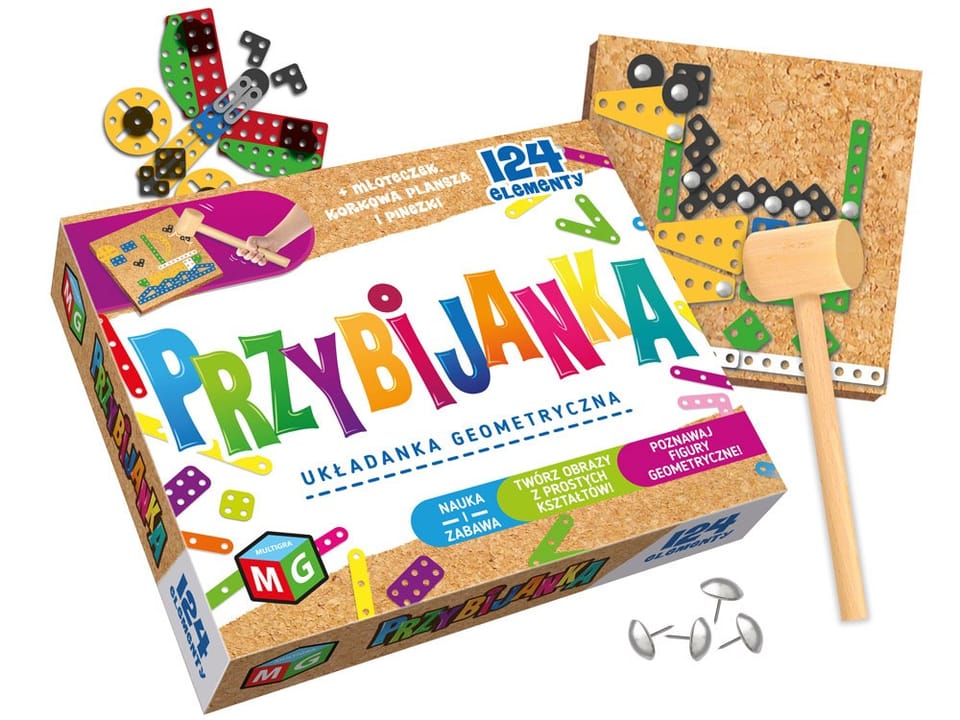 Kreatywna zabawka edukacyjna pozwalająca tworzyć niemal nieskończoną ilość fantazyjnych obrazków, oferująca wspaniałą zabawę oraz idealny sposób na rozwijanie swojej wyobraźni! Zabawa polega na układaniu geometrycznych kształtów na korkowej tablicy, korzystając z metalowych blaszek. Dziecko tworzy kolorowe obrazki poprzez przybijanie kolejnych elementów za pomocą pinezek i drewnianego młotka. W zestawie dołączono album z inspiracjami, pozostawiając graczom także możliwość tworzenia według własnych wyobrażeń. To nie tylko świetna rozrywka, ale także możliwość poznawania figur geometrycznych.tablica korkowa - 1 szt.,metalowe blaszki - 72 szt.pinezki - 50 szt.drewniany młotek - 1 szt.album z inspiracjami