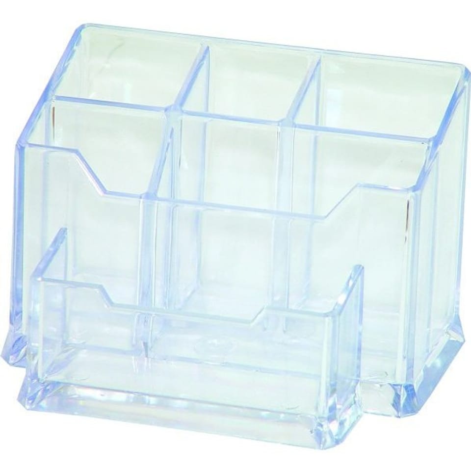 * transparentny * 4 przegrody na akcesoria piszące * 1 przegroda na karteczki (76 x 76 mm) * wykonany z przezroczystego polistyrenu odpornego na pęknięcia * wymiary: 155 x 105 x 101 mm