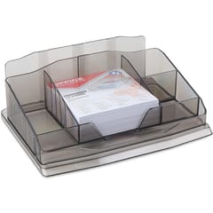 * przybornik na biurko z karteczkami * odporny na pęknięcia * 6 przegródek w tym: * 1 na korespondencję * 4 przegrody na drobne artykuły biurowe * 1 na karteczki (w komplecie) * wymiar komory na karteczki: 90x90mm * wymiar karteczek: 89x89mm * wymiar pojemnika: 190x145x68mm * kolor: dymny