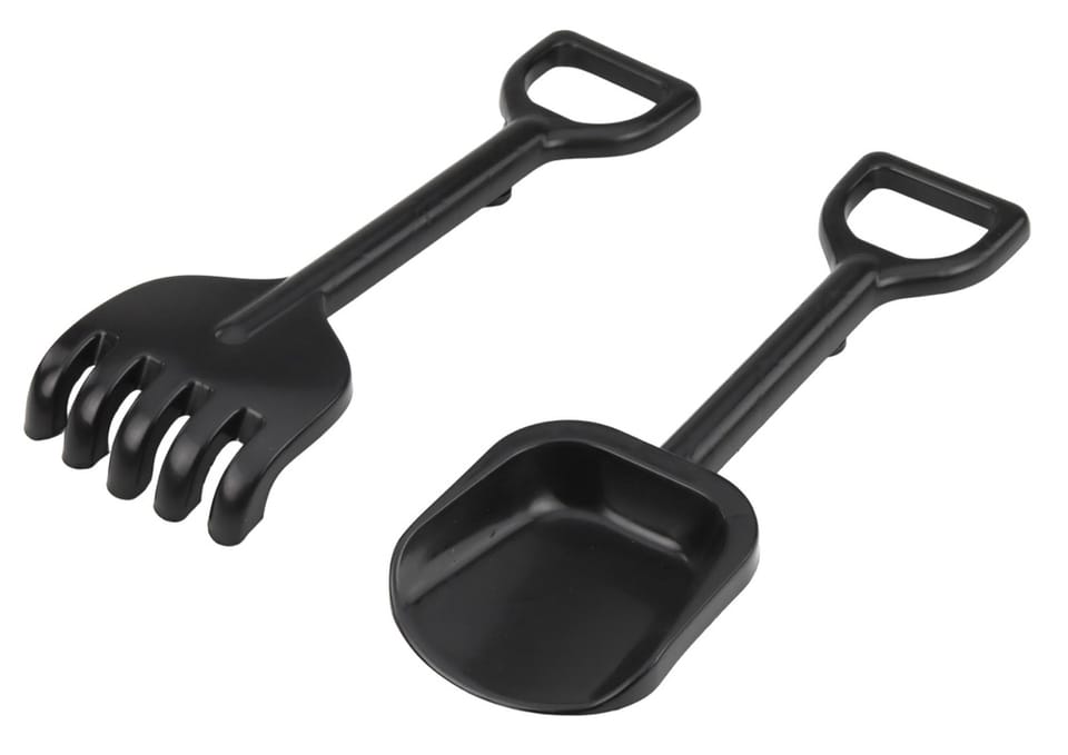W zestawie dodatkowo znajdują się plastikowe grabki oraz łopatka.