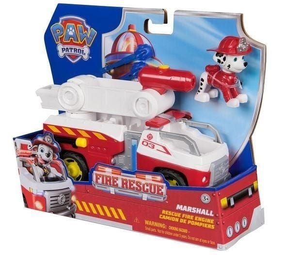 Dołącz do ekipy strażackiej Psiego Patrol z Marshallem i jego pełnym akcji wozem strażackim! Zabawkowa ciężarówka Psiego Patrolu ma 20 cm długości i 8 cm wysokości, dzięki czemu może ruszyć na ratunek podczas każdej zabawy. Marshall, mający ponad 5 cm wzrostu i ubrany w strój strażacki, jest gotowy, aby uratować sytuację. Dzieci mogą przechylać drabinę, wystrzeliwać pociski wodne i przechowywać je we wbudowanych portach, aby mieć do nich szybki dostęp. Prawdziwe działające koła ciężarówki i autentyczna stylistyka Psiego Patrolu sprawiają, że pojazd wygląda tak, jak w serialu, co pozwala na nieskończoną kreatywność w zabawie. Te zabawki edukacyjne z serii Psi Patrol są idealne jako prezent na urodziny, Boże Narodzenie lub inne święta. Aby zabawa była jeszcze lepsza, połącz zestaw z Centrum Dowodzenia Straży Pożarnej, wozem strażackim Deluxe oraz sześcioma różnymi figurkami i pojazdami straży pożarnej (każdy sprzedawany oddzielnie). Przeżyj ponownie przygody z poprzednich sezonów Psiego Patrolu, takich jak Kosmopieski i Film Psi Patrol, lub stwórz nowe przygody z wieżą Psiego Patrolu, poszczególnymi figurkami Psiego Patrolu i ich pojazdami, aby przeżyć przygody z turbodoładowaniem.