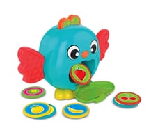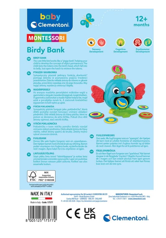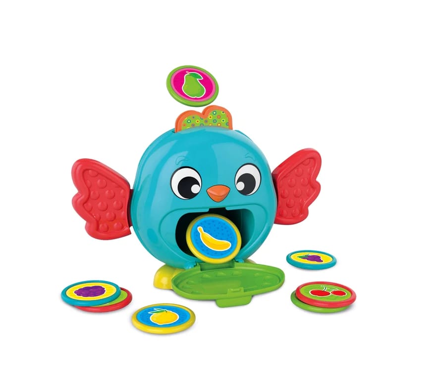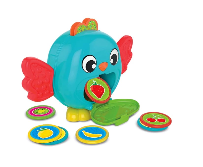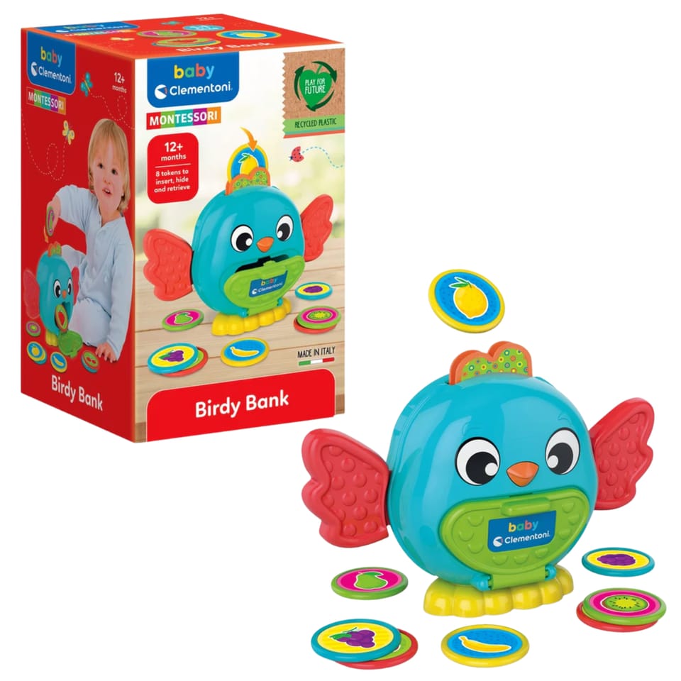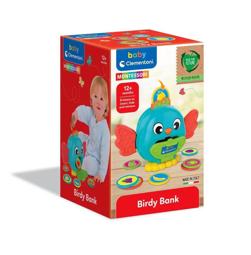 Sympatyczny ptaszek pełniący funkcję skarbonki pomaga dziecku w poznawaniu pojęcia trwałości przedmiotów. Dziecko wkłada żetony do otworu w głowie ptaszka, przez który wpadają one do jego brzuszka. Aby wyjąć żetony, wystarczy otworzyć klapkę.