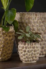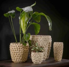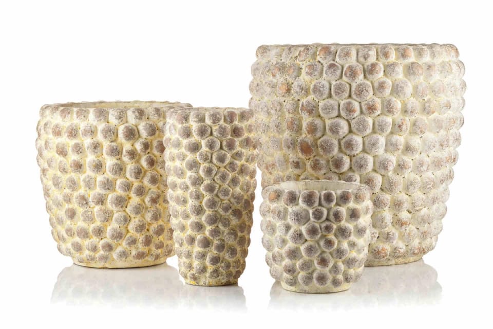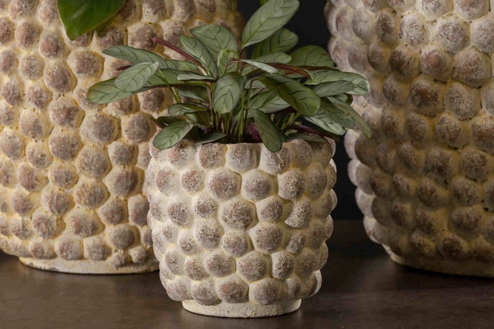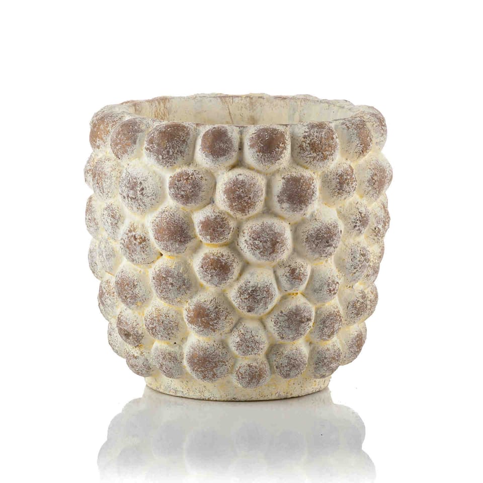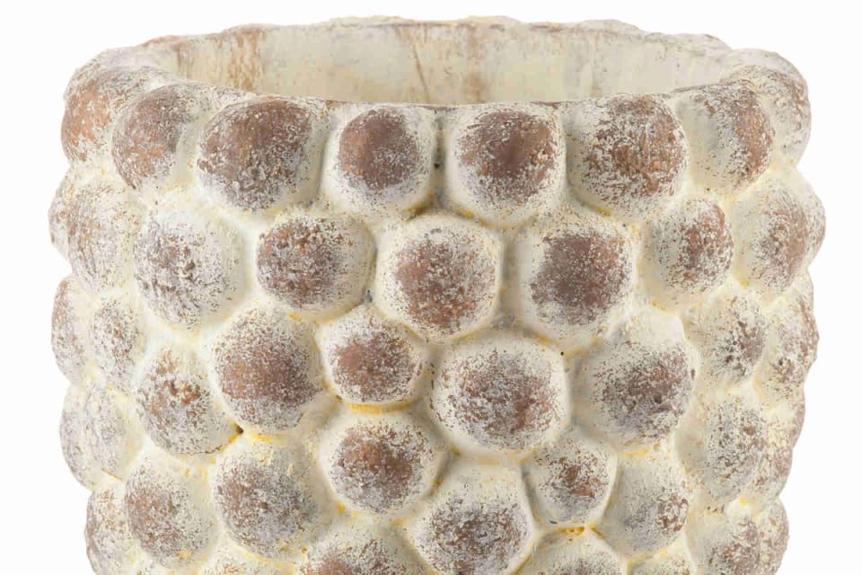 OPIS:Osłona donicy RUIS-L, marki PTMD wykonana z cementu w ciepłym kremowym kolorze z ciemniejszymi przecierkami. Zaprojektowana z kulistym wypukłym (małe kulki) reliefem, sprawia że jest wyjątkowym przedmiotem. Postawiona we wnętrzach z zielonymi roślinami ,będzie przyciągać wzrok i zachwycać przez wiele lat. Osłona bez otworów w dnie. Donice wykonane są ręcznie i rzeczywiste wymiary mogą nieznaczenie odbiegać od deklarowanych (+/- 2%).