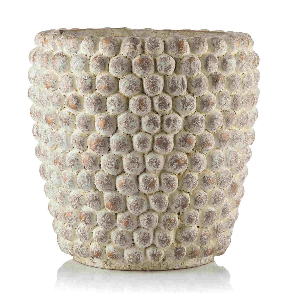 OPIS:Osłona donicy RUIS-XXL, marki PTMD wykonana z cementu w ciepłym kremowym kolorze z ciemniejszymi przecierkami. Zaprojektowana z kulistym wypukłym (małe kulki) reliefem, sprawia że jest wyjątkowym przedmiotem. Postawiona we wnętrzach z zielonymi roślinami ,będzie przyciągać wzrok i zachwycać przez wiele lat. Osłona bez otworów w dnie.