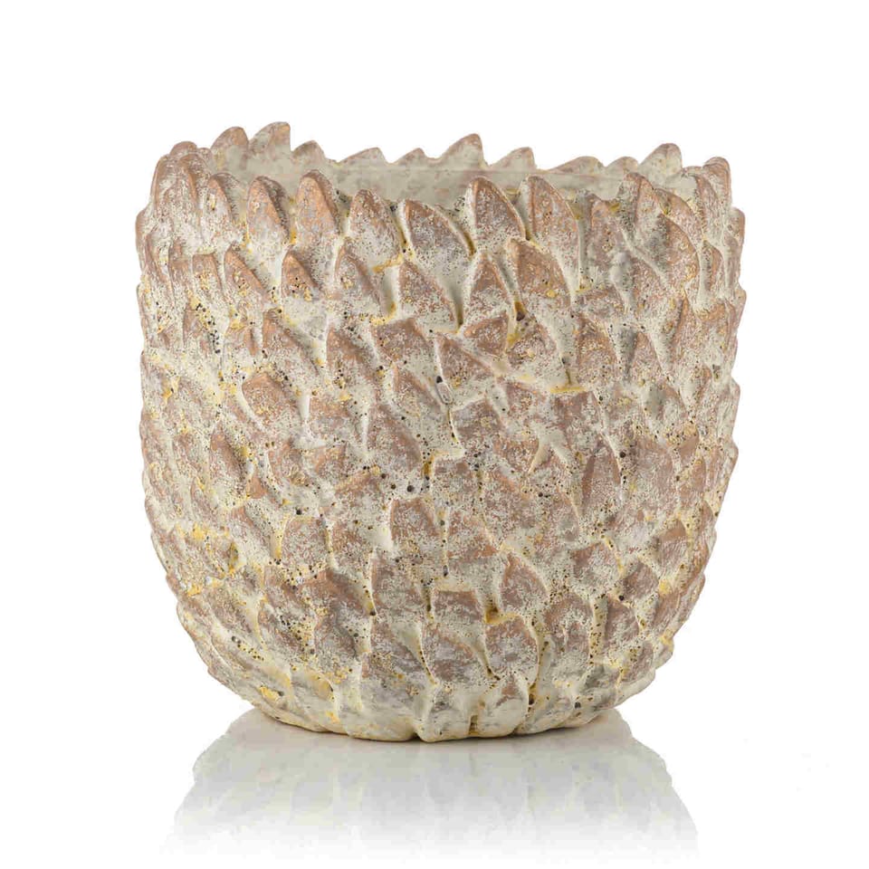 OPIS:Osłona donicy STORMA-L, marki PTMD wykonana z cementu w ciepłym kremowym kolorze. Zaprojektowana z łuskowatym wypukłym reliefem, sprawia że jest wyjątkowym przedmiotem. Postawiona we wnętrzach z zielonymi roślinami ,będzie przyciągać wzrok i zachwycać przez wiele lat. Osłona bez otworów w dnie.