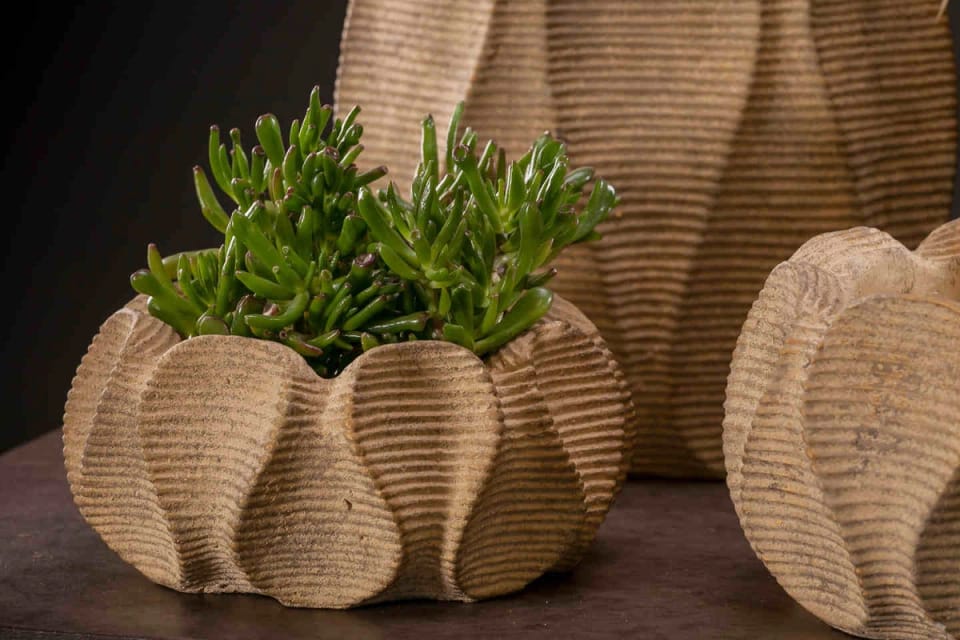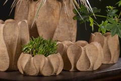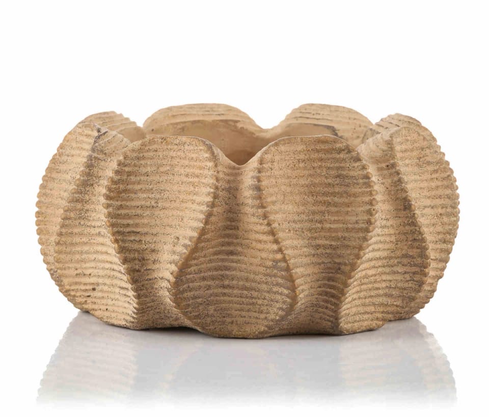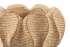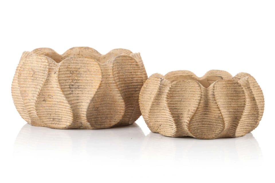 OPIS:Osłona donicy (misa) WAXY, marki PTMD wykonana z cementu w ciepłym brązowym kolorze, wykończona żebrowanym wzorem. Zaprojektowana w niespotykanej formie połączonych płatków kwiatowych, sprawia że jest wyjątkowym przedmiotem. Postawiona we wnętrzach w formie dekoracji lub z zielonymi roślinami ,będzie przyciągać wzrok dając ponadczasowy element wystroju wnętrz. Osłona bez otworów w dnie.