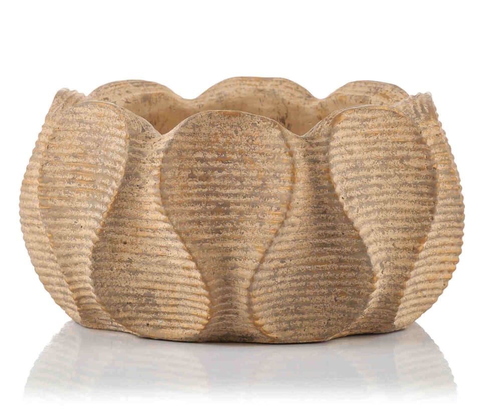OPIS:Osłona donicy (misa) WAXY, marki PTMD wykonana z cementu w ciepłym brązowym kolorze, wykończona żebrowanym wzorem. Zaprojektowana w niespotykanej formie połączonych płatków kwiatowych, sprawia że jest wyjątkowym przedmiotem. Postawiona we wnętrzach w formie dekoracji lub z zielonymi roślinami ,będzie przyciągać wzrok dając ponadczasowy element wystroju wnętrz. Osłona bez otworów w dnie.