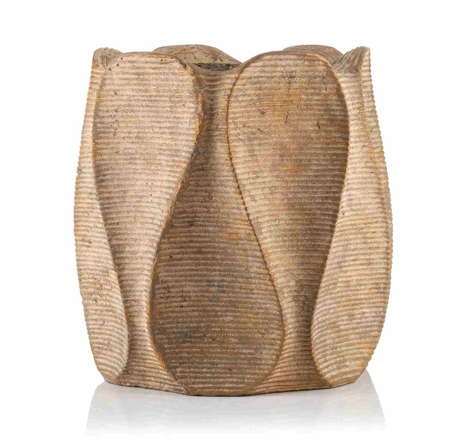 OPIS:Osłona donicy (okrągła) WAXY, marki PTMD wykonana z cementu w ciepłym brązowym kolorze, wykończona żebrowanym wzorem. Zaprojektowana w niespotykanej formie połączonych płatków kwiatowych, sprawia że jest wyjątkowym przedmiotem. Postawiona we wnętrzach w formie dekoracji lub z zielonymi roślinami ,będzie przyciągać wzrok dając ponadczasowy element wystroju wnętrz. Osłona bez otworów w dnie.
