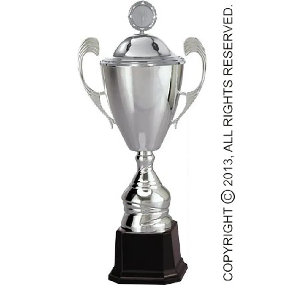 Wysoki puchar w kolorze błyszczącego srebra, z szerokim kielichem z wygodnymi uszami i przykrywką.Parametry:? wysokość pucharu: 44 cm? średnica kielicha: 14 cm? kolor: srebrny? materiał: plastik, metal? wymiary tabliczki: 0,85x0,4 cm