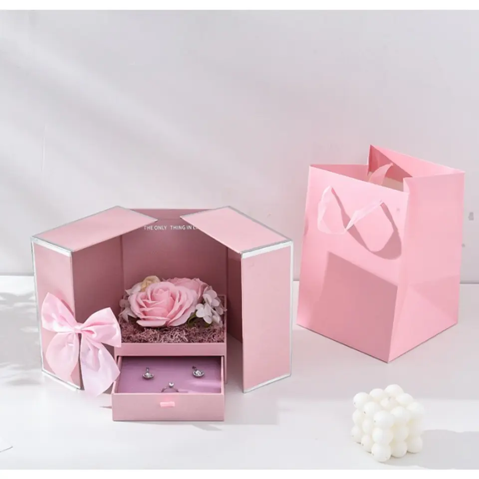 Wyjątkowe pudełeczko na biżuterię Pudełeczko idealne na prezent oraz jako niepowtarzalna oprawa dla biżuterii.Pod przeźroczystą osłonką znajduje się 9 czerwonych mydlanych różyczek. Pudełeczko posiada wysuwaną szufladkę na naszyjnik lub bransoletkę. Wymiary pudełeczka:18 x 14 x 14 cm Pudełeczko zapakowane w elegancką torebkę w tym samym kolorze.