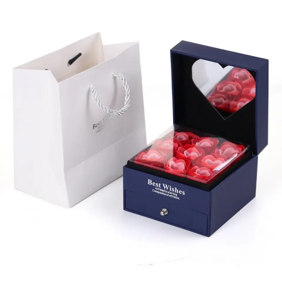 Wyjątkowe pudełeczko na biżuterię Pudełeczko idealne na prezent oraz jako niepowtarzalna oprawa dla biżuterii.Pod przeźroczystą osłonką znajduje się 9 czerwonych mydlanych różyczek. Pudełeczko posiada wysuwaną szufladkę na naszyjnik lub bransoletkę. Wymiary pudełeczka:18 x 14 x 14 cm Pudełeczko sprzedawane w zestawie z torebeczką.