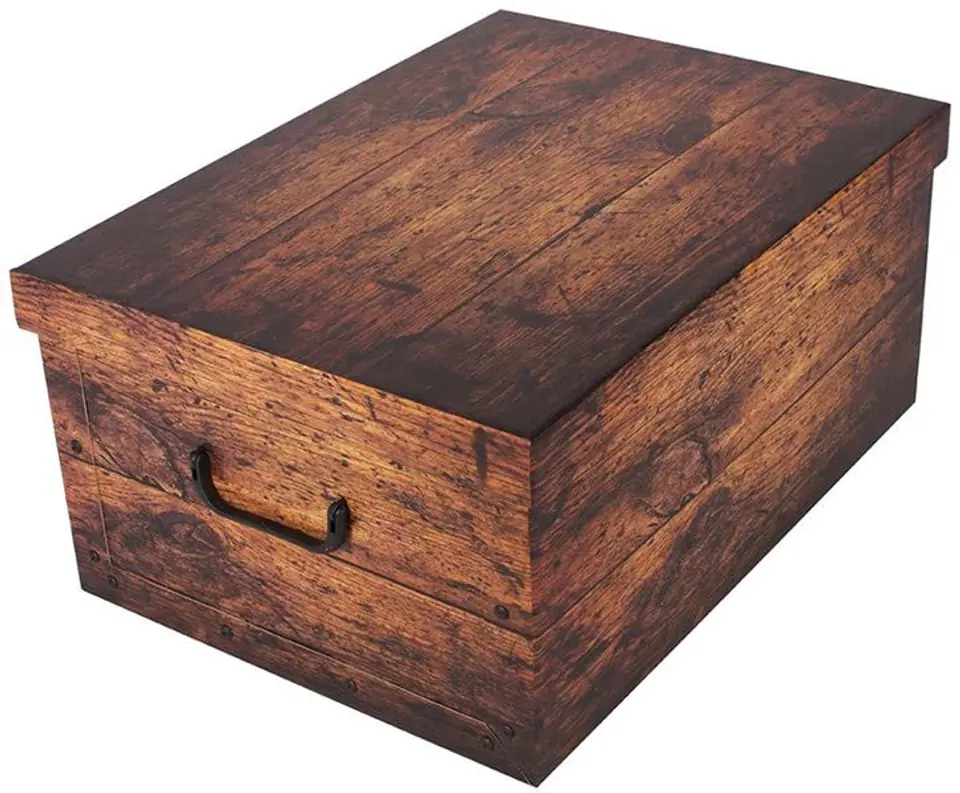 Pudełko kartonowe MAXI stylizowane na deski doskonale nadaje się do przechowywania ubrań, dokumentów, zabawek i akcesoriów. Sprawdzi się w garderobie, biurze, pokoju dziecięcym oraz jako eleganckie opakowanie prezentowe.