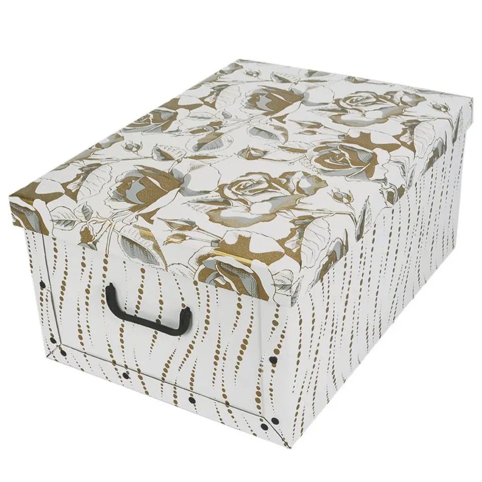 Pudełko kartonowe MAXI “Złote róże” to eleganckie i praktyczne rozwiązanie do organizacji przestrzeni w domu, biurze czy garderobie. Wykonane z kartonu w 100% z recyklingu, łączy stylowy design z troską o środowisko. Wzór złotych róż nadaje wnętrzu luksusowego, a zarazem subtelnego charakteru.