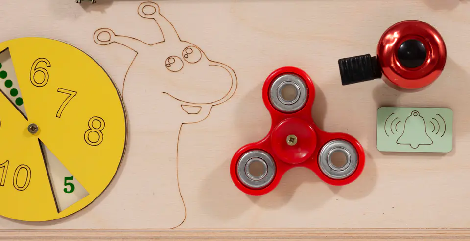 kolorowe kółka zębate, dzwonek rowerowy, fidget spinner rozwijają motorykę małą i koordynację ruchowo-wzrokową