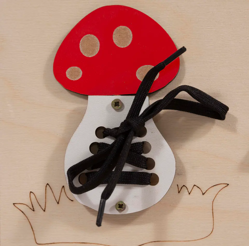 lis z guzikami, grzybek ze sznurówką, zamek błyskawiczny, rzep, zasuwki, haczyki rozwijają sprawność manualną i uczą rozwiązywania problemów.