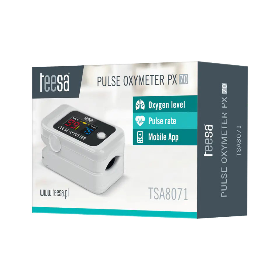 Medyczny pulsoksymetr napalcowy z Bluetooth Teesa PX70 Zadbaj o zdrowie już dziś! Pulsoksymetr Teesa PX70 to urządzenie do mierzenia saturacji, tętna oraz indeksu perfuzji. Jego niewielkie wymiary sprawiają, że możesz mieć go zawsze przy sobie, aby w każdym momencie wykonać pomiar. Badanie pulsoksymetrem jest banalnie proste! Wystarczy wsunąć palec w urządzenie tak, aby spoczywał na czujniku, położyć rękę na płaskiej powierzchni i wcisnąć przycisk. To wszystko. Wygodne, prawda? Dokładne pomiary Zależy Ci na dokładnych pomiarach? Pulsoksymetr na palec wykonuje trzy pomiary: natlenienia krwi w zakresie 35-100%, pulsu w zakresie 25-250 uderzeń na minutę oraz indeksu perfuzji, czyli siły pulsu w miejscu założenia czujnika. Wyświetlacz LCD Sam pomiar trwa tylko kilka sekund, a wszystkie wyniki już po kilku chwilach pojawią się na czytelnym, kolorowym wyświetlaczu LCD. Pulsoksymetr z Bluetooth Pulsoksymetr Teesa PX70 posiada funkcję Bluetooth, dzięki której możesz połączyć urządzenie ze swoim smartfonem i przechowywać pomiary w aplikacji. Co więcej, aplikacja pozwala zachować dane wielu użytkowników, dlatego możesz przechowywać wyniki całej rodziny.