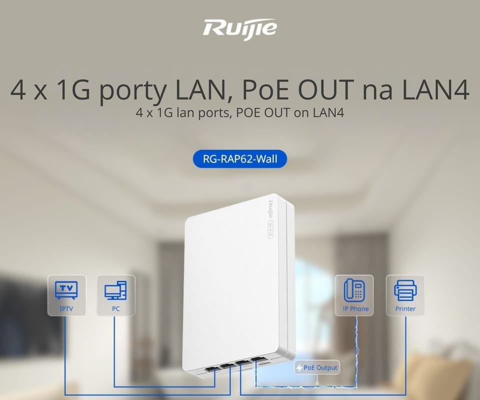 RG-RAP62-WALL to punkt dostępowy Wi-Fi 6 marki Ruijie, przeznaczony do montażu ściennego w sieciach hotelowych i biurowych. Oferuje dwupasmową transmisję, wysoką wydajność oraz obsługę wielu użytkowników dzięki technologii OFDMA i MU-MIMO. Zasilanie PoE oraz kompaktowa konstrukcja ułatwiają instalację i integrację z istniejącą infrastrukturą sieciową.