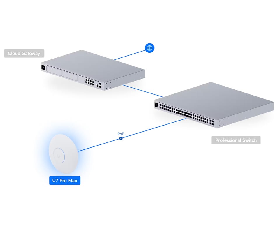 Ubiquiti U7 Pro Max to montowany na suficie punkt dostępowy WiFi 7, idealny do wymagających środowisk na dużą skalę. Wyposażony w osiem strumieni przestrzennych i obsługę pasma 6 GHz, zapewnia zaawansowaną wydajność. Dzięki dedykowanemu mechanizmowi skanowania widmowego, U7 Pro Max oferuje analizę spektralną w czasie rzeczywistym dla optymalnego wyboru kanału i wolnego od zakłóceń WiFi.