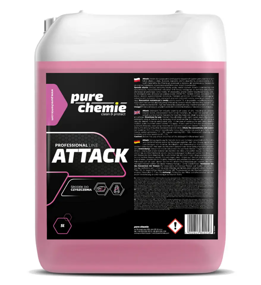 Pure Chemie Attack – to wszechstronny preparat czyszczący do większości rodzajów zabrudzeń, takich jak plamy z oleju, tłuszczu, napojów, plamy organiczne, przebarwienia z innych materiałów itp. Produkt może być stosowany jako oprysk, jak i z pianownicy. Przeznaczony do prania materiałów, czyszczenia plastików i innych powierzchni.
