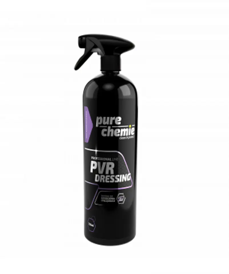 Pure Chemie PVR Dressing – to produkt jednocześnie czyszczący i zabezpieczający wewnętrzne elementy z plastiku i gumy. Pozostawia antystatyczne, hydrofobowe, półmatowe wykończenie. Usuwa codzienne i trudne zabrudzenia. Nie pozostawia smug, zacieków i z łatwością się dociera.