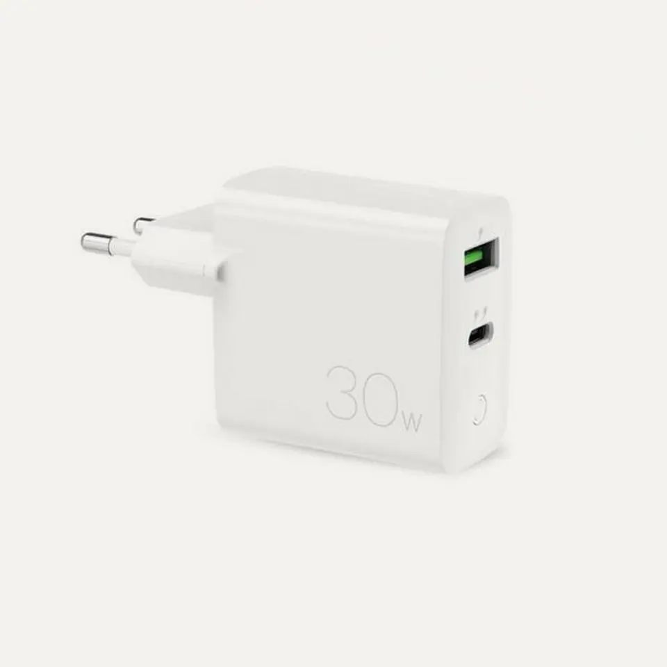 Kompaktowa ładowarka sieciowa wyposażona w dwa porty 1 x USB-A oraz 1 x USB-C PD o mocy 30 W, do jednoczesnego ładowania kilku urządzeń.Technologia Power Delivery dostosowuje napięcie i natężenie ładowania do maksymalnych wartości, które zapewniają bezpieczne ładowanie urządzenia. Rozwiązanie to pozwala używać tej samej ładowarki do ładowania różnych telefonów, a także tabletów oraz innych urządzeń mobilnych.Ładowarka została ponadto wyposażona w zaawansowany system przeciwprzepięciowy dzięki wbudowanemu inteligentnemu chipowi SmartChip. Automatyczne wykrywanie urządzenia mobilnemu aby zapewnić optymalna moc zasilania.Wysoka moc oraz nowoczesny port USB-C pozwalają korzystać z funkcji szybkiego ładowania w najnowszych modelach telefonów Apple oraz Android.Cechy produktu:· Jedna ładowarka do wielu urządzeń (smartfon, tablet, laptop)· Zasilanie USB-C do 30W· Nowoczesny port USB-C PD (Power Delivery)· Szybkie ładowanie USB-A do 18W· Wejście: AC 110-240 V