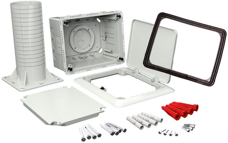 Uniwersalna puszka połączeniowa do instalowania urządzeń elektrycznych (np. sprzętu elektrycznego, gniazd dystrybucyjnych, itp.) na docieplanych elewacjach budynków o grubości od 120 do 330 mmWytrzymała konstrukcjaEliminacja powstawania mostów cieplnychW komplecie z puszką znajduje się nośnik (tuba) oraz otwierana pokrywa z gumową uszczelką