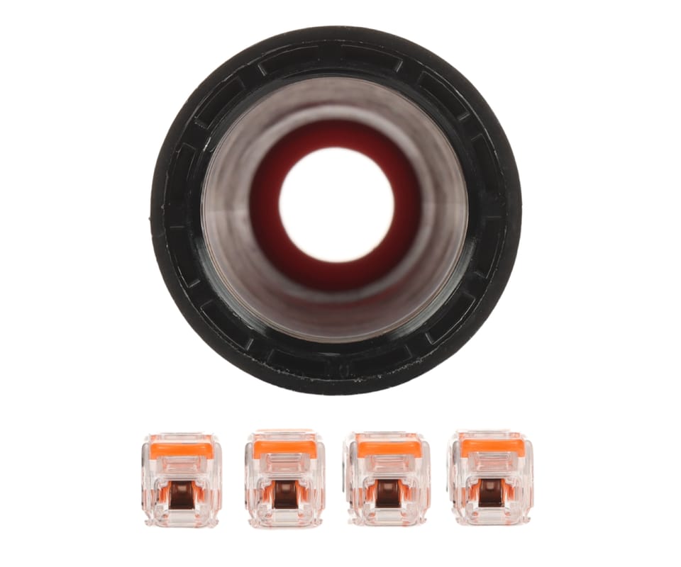 Puszka hermetyczna IP68 przeznaczona do szybkiego i łatwego łączenia przewodów zasilającychW komplecie znajdują się cztery przelotowe kostki elektryczne WAGO-221 z zaciskami sprężynowymi do łączenia przewodów miedzianych