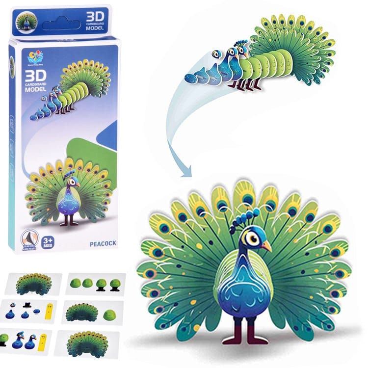 Zbuduj model uroczego pawia! Kartonowy model 3D to kreatywna układanka, która pozwala dziecku samodzielnie złożyć trójwymiarową figurkę kolorowego pawia. Elementy wykonane są z kolorowego, trwałego kartonu, który łatwo się łączy - wystarczy oderwać i postępować zgodnie z instrukcją zamieszczoną na pudełku.