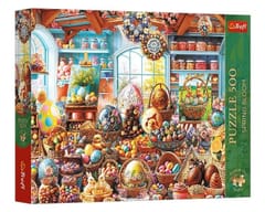 Puzzle Spring Bloom: Wielkanocny sklepik ze słodyczami przedstawiają kolorowy, wiosenny sklepik wypełniony ozdobnymi pisankami, koszyczkami, słodyczami i wielkanocnymi dekoracjami ustawionymi na półkach i stolikach. Po ich ułożeniu powstanie obraz o wymiarach 480x340 mm.