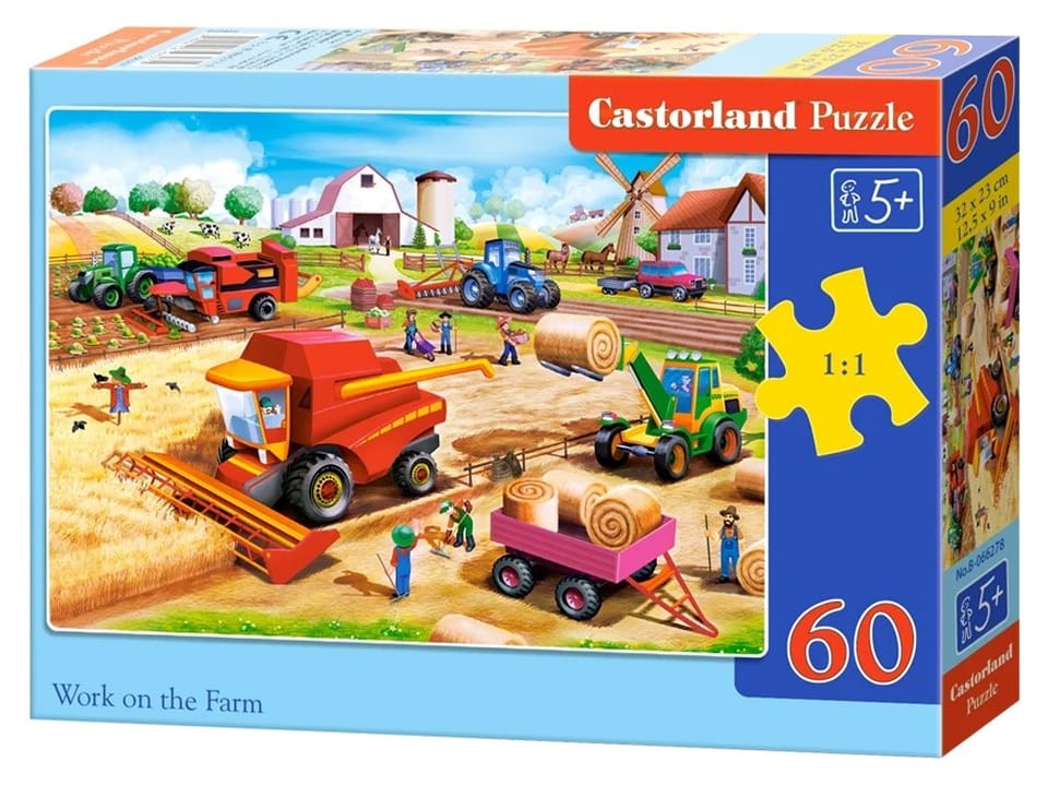PUZZLE 60EL. WORK ON THE FARM Rozmiar układanki: 320 × 230 mm Rozmiar pudełka: 245 × 175 × 37 mm Waga pudełka: 0.16 kg