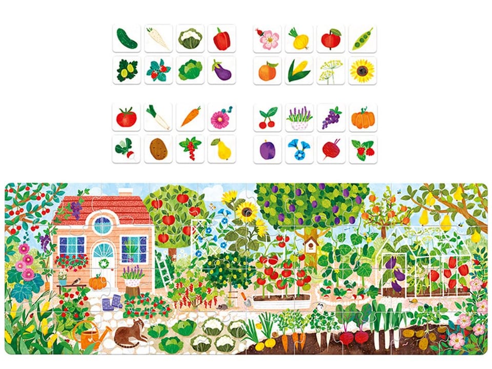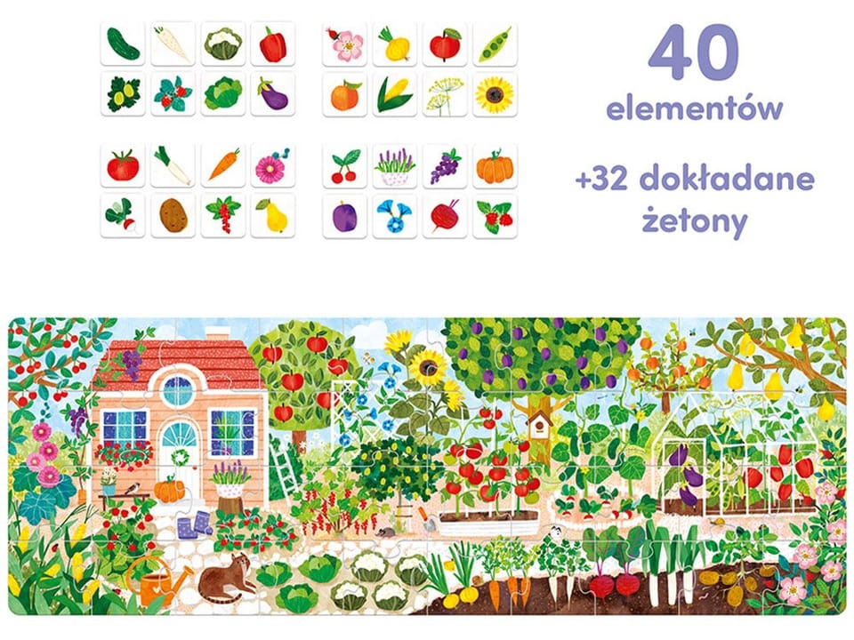 Chodźmy razem do ogrodu! Wytężcie wzrok, przygotujcie rączki i zobaczcie, co tu rośnie. Soczyście kolorowa i duża układanka składa się z 40 elementów i przedstawia kwitnący ogród i sad. 32 owoce i warzywa znajdują się na dodatkowych kafelkach do dokładania. Umożliwia to mnóstwo fascynujących i wszechstronnie rozwijających zabaw, które pozwolą lepiej zrozumieć i zapamiętać, co rośnie w ogródku. Mnóstwo przyrodniczych ciekawostek znajdziecie na plakacie dołączonym do puzzli. Edukacyjny zestaw sprawdzi się jako pomysł na mądry prezent dla ciekawego świata przedszkolaka.Wyjątkowa cecha: zestaw pozwala na kreatywne zabawy na wiele sposobów.Puzzle Co rośnie w ogródku to wyjątkowy zestaw edukacyjny dla odkrywców w wieku przedszkolnym. Składa się z dużych 40-elementowych puzzli i 32 dokładanych obrazków oraz plakatu edukacyjnego i pozwala na mnóstwo kreatywnych zabaw. Zwróćcie baczną uwagę na to, co rośnie na grządkach, krzaczkach i drzewach w ogrodzie!Znana i bliska dzieciom tematyka inspiruje do zabawy, która pozwala przedszkolakom rozwijać kluczowe umiejętności i zdobywać nową wiedzę w pełen radości sposób. Bawcie się i uczcie!Ułóżcie puzzleTo doskonały sposób na spędzanie czasu, samodzielnie lub w ulubionym towarzystwie. A ponieważ wymaga skupienia i precyzji, znakomicie rozwija zdolności manualne, wyobraźnię i spostrzegawczość.Dołóżcie elementyCo gdzie rośnie? Kto ma bystre oko? Kto jest najszybszy? Kto zna wszystkie owoce i warzywa z ilustracji i obrazków? Spróbujcie dokładać je na czas!Poznawajcie nowe słowaNazywajcie owoce, warzywa i wszystko, co widzicie na ilustracji. Co rośnie w ziemi, co na krzakach lub drzewach. Opowiadajcie sobie o tym, skąd pochodzi nasze jedzenie. Znajdźcie pyszności z obrazków w Waszym domu! A może pójdziecie do warzywniaka i wypróbujecie coś zupełnie nowego?Ugotujcie coś razem! Narysujcie ulubione warzywa i owoce.Dajcie się ponieść wyobraźni!