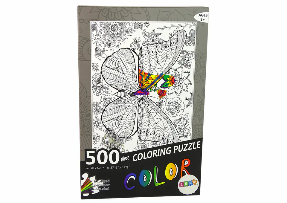 W zestawi znajdziemy 500 sztuk puzzli czarno- białych oraz 6 sztuk pisaków, którymi pomalujesz obrazek tak jak wyobraźnia podpowiada. Puzzle przedstawiają pięknego motyla w otoczeniu kwiatów.