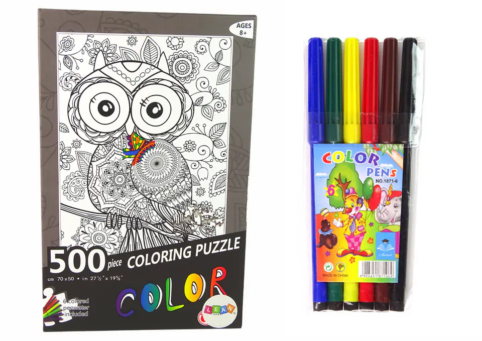 W zestawi znajdziemy 500 sztuk puzzli czarno- białych oraz 6 sztuk pisaków, którymi pomalujesz obrazek tak jak wyobraźnia podpowiada. Puzzle przedstawiają piękną sowę w otoczeniu kwiatów.